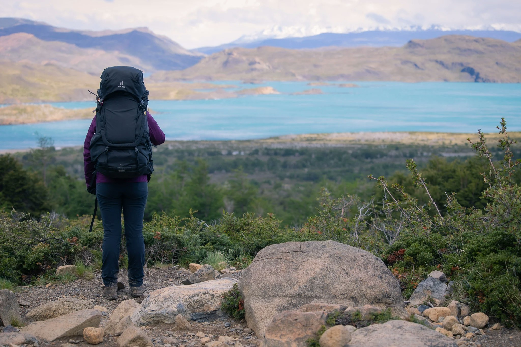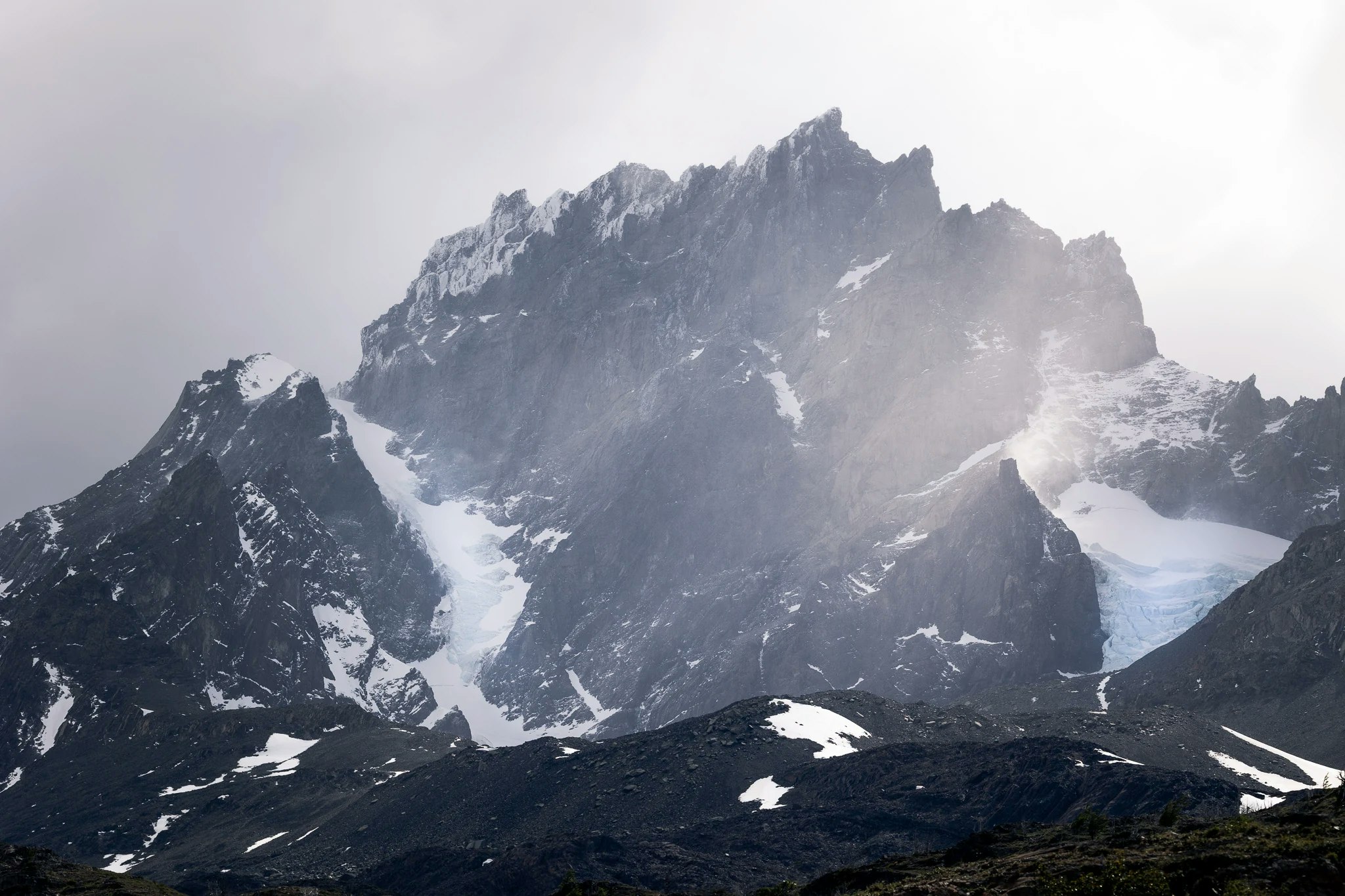 The start of our trek was at Paine Grande, where we arrived by catamaran. The first day's hike was a fairly short one, just 12km with a couple hundred meters of altitude, but with the heavy packs. The path wound through shrub and many dead trees along a small beautiful lake with a small island in it, before spotting Lago Grey, and more impressively the first ice bergs floating inside of it. Being a glacier lake, Lago Grey is fed by Grey Glacier that's part of the Southern Patagonian Ice Field. Spotting the glacier from the top of the mountain pass was mind-boggling. Even from afar you could tell that the covered area is massive. At the same time, the winds on the pass were incredible, we kept adjusting our steps and posture to compensate for the wind pushing against us and howling around our ears. After a quick snack we hiked on till we arrived at the hut and our first accommodation for the night. A very dramatic incident that happened only a week after we were there shows just how severe the weather in this area can get. Sadly, a group of 5 hikers got caught in a heavy snow storm just a few hours hike away from Grey hut and died. We didn't know at the time obviously, but it certainly shocked us when we read about it afterwards.