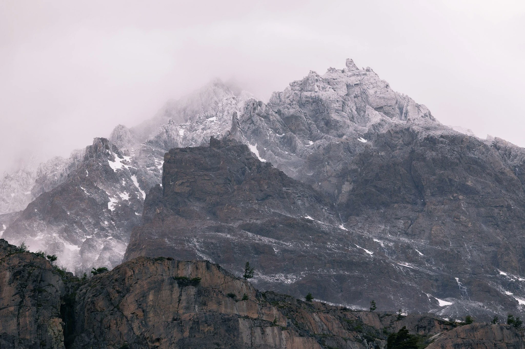 Our first highlight of the trek came on day 3: on our way to Frances campsite we decided to hike up Mirador Britanico despite the intense rains and winds. Luckily, there was a small shelter where we were able to drop off our heavy backpacks to pick them up after going up the 600m of altitude. Climbing over big rocks trying not to slip we approached French glacier on the opposite side of the valley first. When we arrived at the first lookout the visibility was horrendous where we were heading. On the evening before we met a couple of new faces, Julia and Miri, Heidi and Marek as well as Marcel, who came down again from the first viewpoint when we crossed them. They mentioned that they couldn't see anything, but we still decided to give it a shot and went on where they turned back. We still had a climb in front of us and we were already drenched, but after another ~40 minutes the clouds were suddenly swept away. One very friendly hiker that was on his way back was beaming - "Go on quickly now, the view is fantastic. You're very lucky that it's just clearing up!", he said. Excitedly, we hiked on and soon afterwards we were rewarded for our earlier decision. Arriving at an open stony area, we realised what majestic peaks were surrounding us. The very pointy and rugged mountain range presented itself in wonderful colours. The final part to get to the Britanico viewpoint lead up a steep cliff still covered in snow. When we finally arrived at the top we sucked in the rewarding accomplishment and fantastic scenery while chewing on a cereal bar to refuel.
