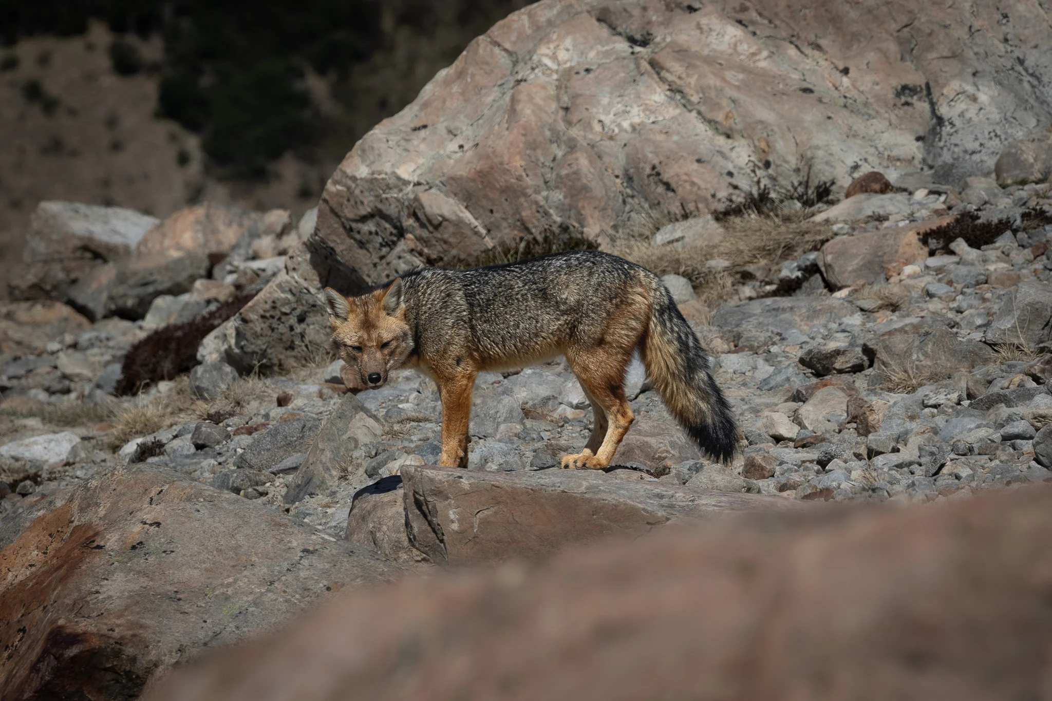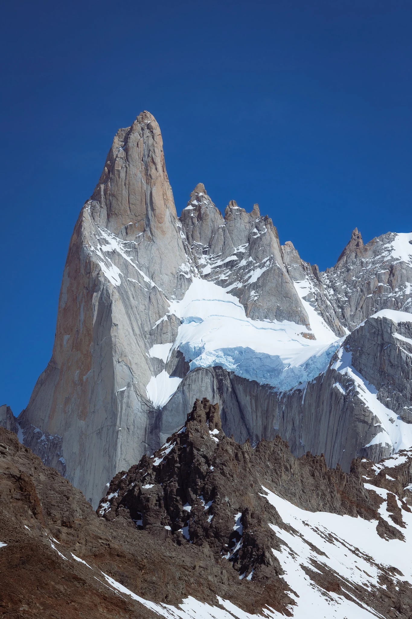 After we recovered from our colds we decided that we also want to see the Argentinian part of Patagonia. Being just a 3h bus-ride away, it was a fairly easy thing to do. El Chalten and El Calafate both offer a great variety of hikes and scenery. A very impressive experience was Perito Moreno, a famous and huge glacier that ends in a glacier lake full of ice bergs. The astonishing blue colours of the glacier and the occasional rumbling of breaking icebergs stuck with us. We ended our time in Patagonia in the charming little mountain village El Chalten where we went on another famous hike to see Mount Fitz Roy (the silhouette of which is depicted in the outdoor brand logo Patagonia). Once again words don't do justice to the incredible scenery. On the top of the hike, we curiously spotted a fox that was scavenging left-overs from the hikers having their lunches.
